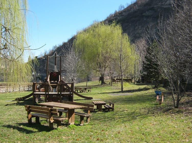 In loc. capoluogo, dopo il primo ponte che consente l’ingresso nel borgo di Villeneuve, attraversando il capiente parcheggio pubblico che si trova sulla destra si accede alla grande area verde che si affaccia sulla Dora Baltea.