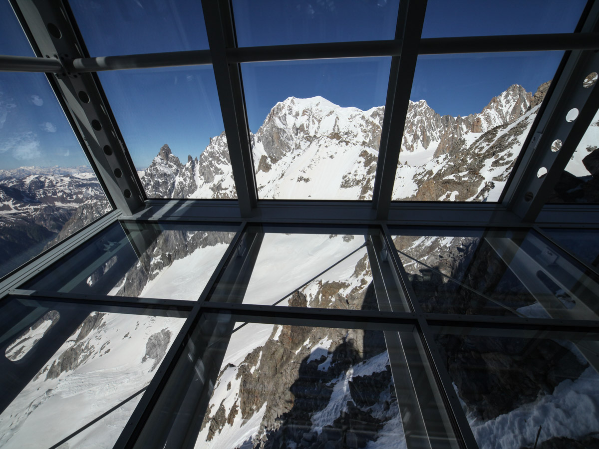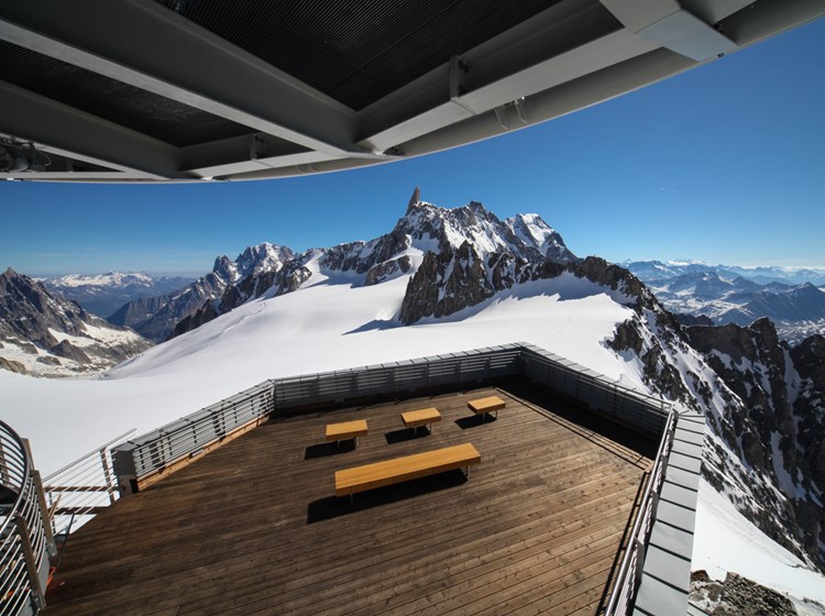 L’ultima stazione è quella di Punta Helbronner. Qui puoi salire sulla terrazza panoramica circolare che regala una vista straordinaria sulle montagne più alte delle Alpi Occidentali.