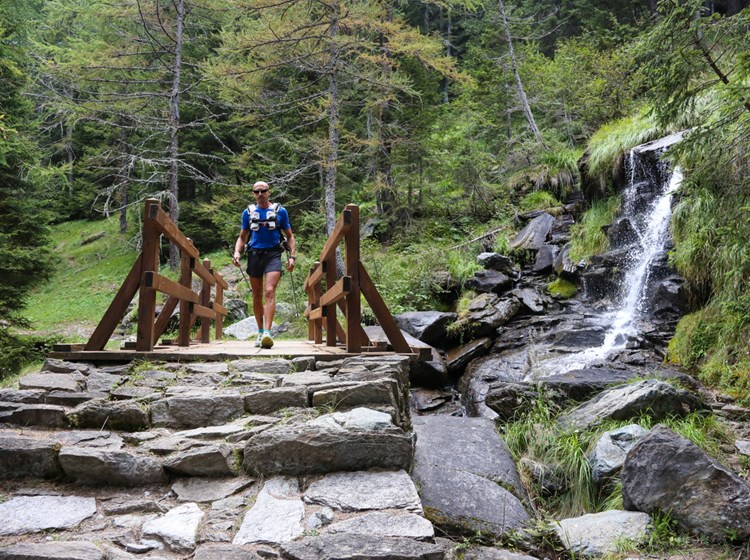 Raggiunto il ponte si attraversa il torrente Ayasse e si prosegue ancora, prima nel bosco, poi tra i prati, fino ad immettersi su una larga strada in pietra, costruita ai tempi del Re Vittorio Emanuele II per le sue battute di caccia.