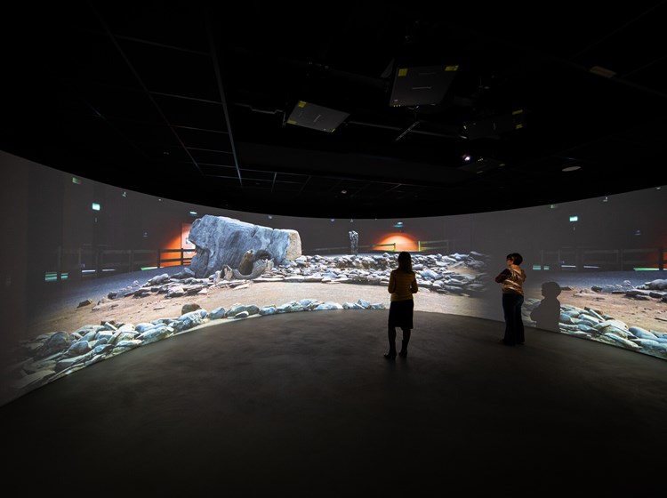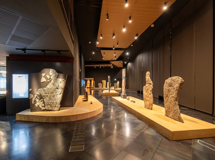 Si apre allo sguardo un ambiente grandioso: attraversando la dimensione del tempo, i toni delle luci colorano l’atmosfera che avvolge i reperti archeologici, il dolmen, le stele abbattute, le piattaforme, le tracce delle arature. La visita è un continuo affaccio sul sito archeologico, in una sorta di costante dialogo “interno-museo / esterno-sito”.