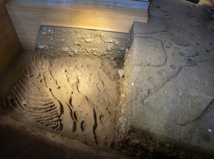 - La sezione dedicata alla Protostoria che illustra i grandi cambiamenti verificatisi nell’area all’inizio del II millennio a.C., quando la funzione agricola prende il sopravvento su quella funeraria: si possono osservare numerose orme umane impresse nel terreno arato ritrovate in occasione dei più recenti scavi archeologici. In questo spazio, inoltre, si apprezza il grande tumulo funerario dell’Età del Ferro (I millennio a.C.) con il suo piano di calpestio originale.