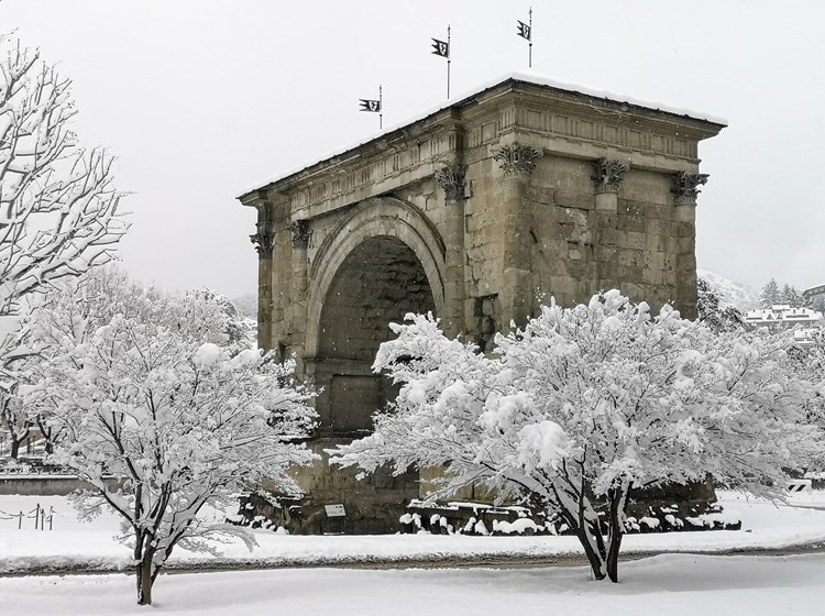 Appena passato il ponte sul torrente Buthier, lungo la strada che portava alla monumentale Porta Praetoria, principale via di accesso alla città romana, fu innalzato l’arco onorario dedicato all’imperatore Augusto