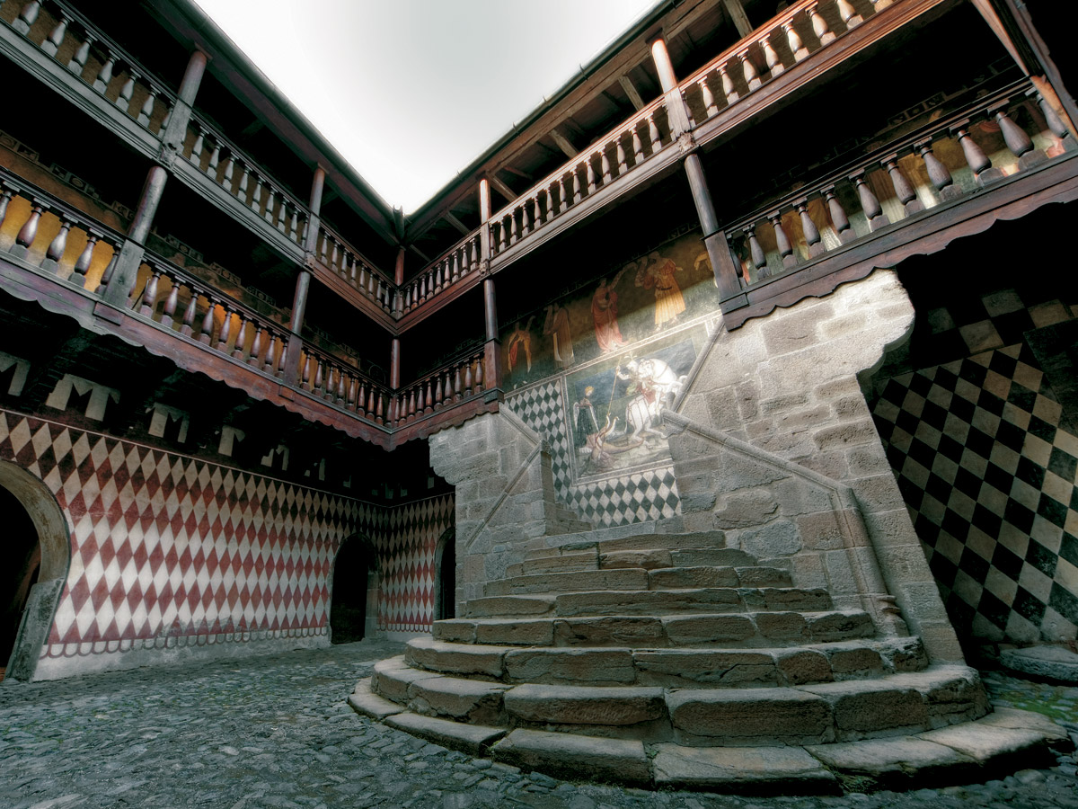 Il percorso si conclude nel cortile interno, con lo scalone semicircolare sovrastato dal pregevole affresco raffigurante San Giorgio che uccide il drago; alzando lo sguardo al piano superiore si possono ammirare le balconate in legno decorate da un gruppo di saggi e di profeti recanti dei cartigli sui quali si leggono proverbi e sentenze morali in antico francese. La parete orientale infine è ornata dai dipinti dell’Annunciazione e di San Cristoforo, attribuiti ad un pittore vicino alla scuola di Jaquerio e databili intorno al 1425-30.