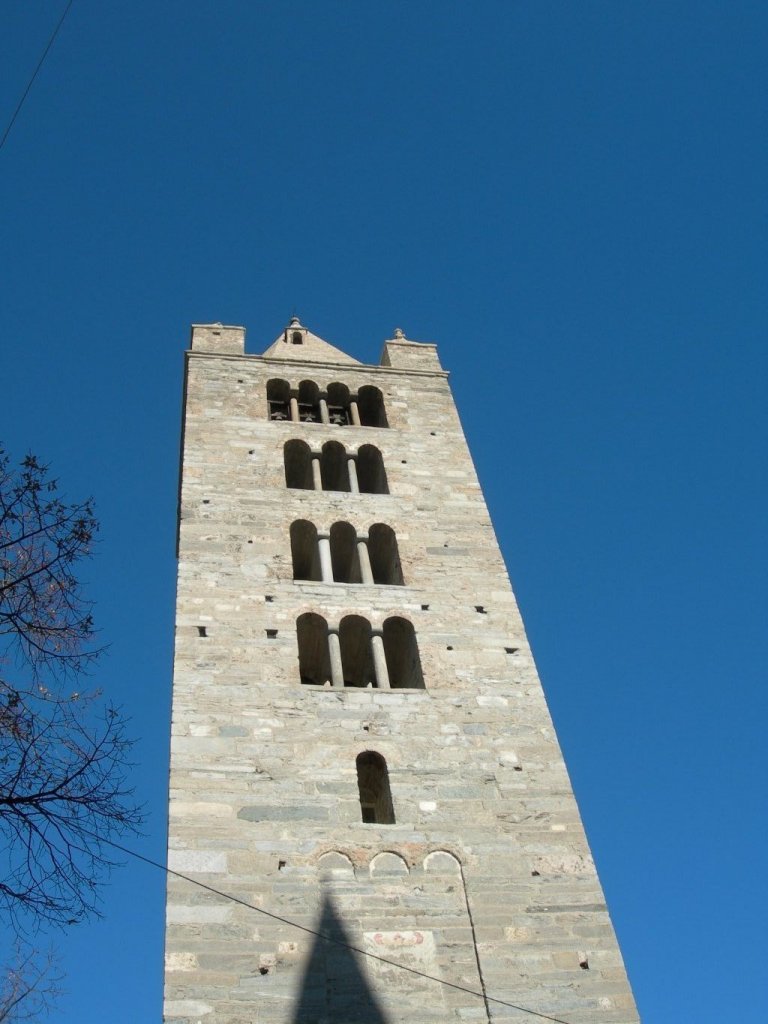 All’inizio dell’XI secolo, viene costruita la chiesa romanica che ingloba il campanile nella nuova facciata, malgrado la sua posizione sia eccentrica rispetto all’asse longitudinale della nuova chiesa. L’edificio è a pianta basilicale, diviso in tre navate concluse da absidi semicircolari.