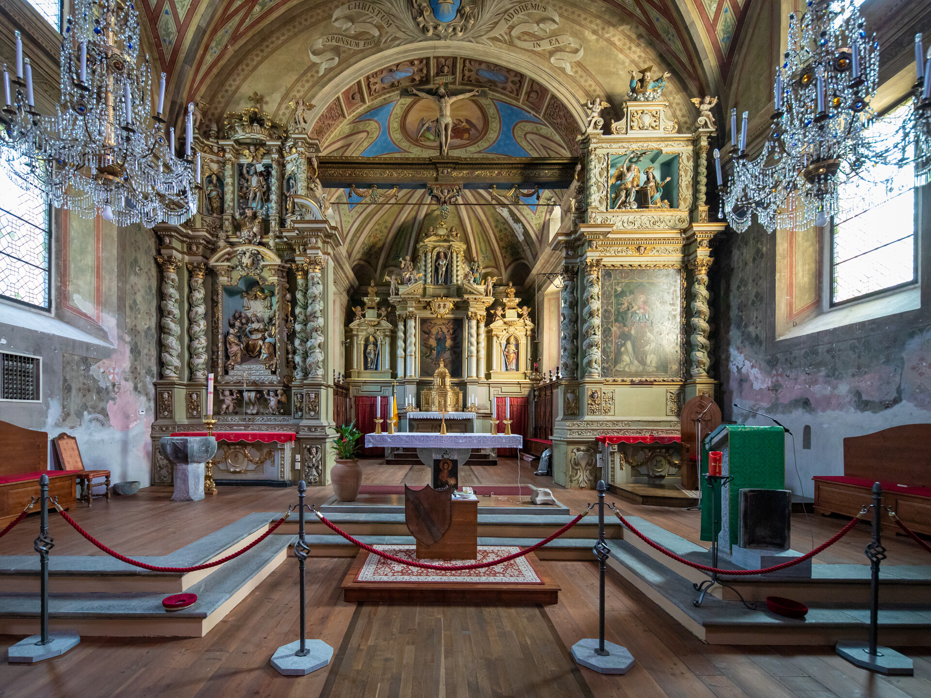 Degno di nota è il portale seicentesco in pietra tagliata e scolpita e, nell’interno, interessanti sono anche gli altari barocchi in legno intagliato, dipinto e dorato. Gli stalli in noce del coro sono databili alla fine del secolo XVII e recano diversi stemmi di famiglie nobili della parrocchia.