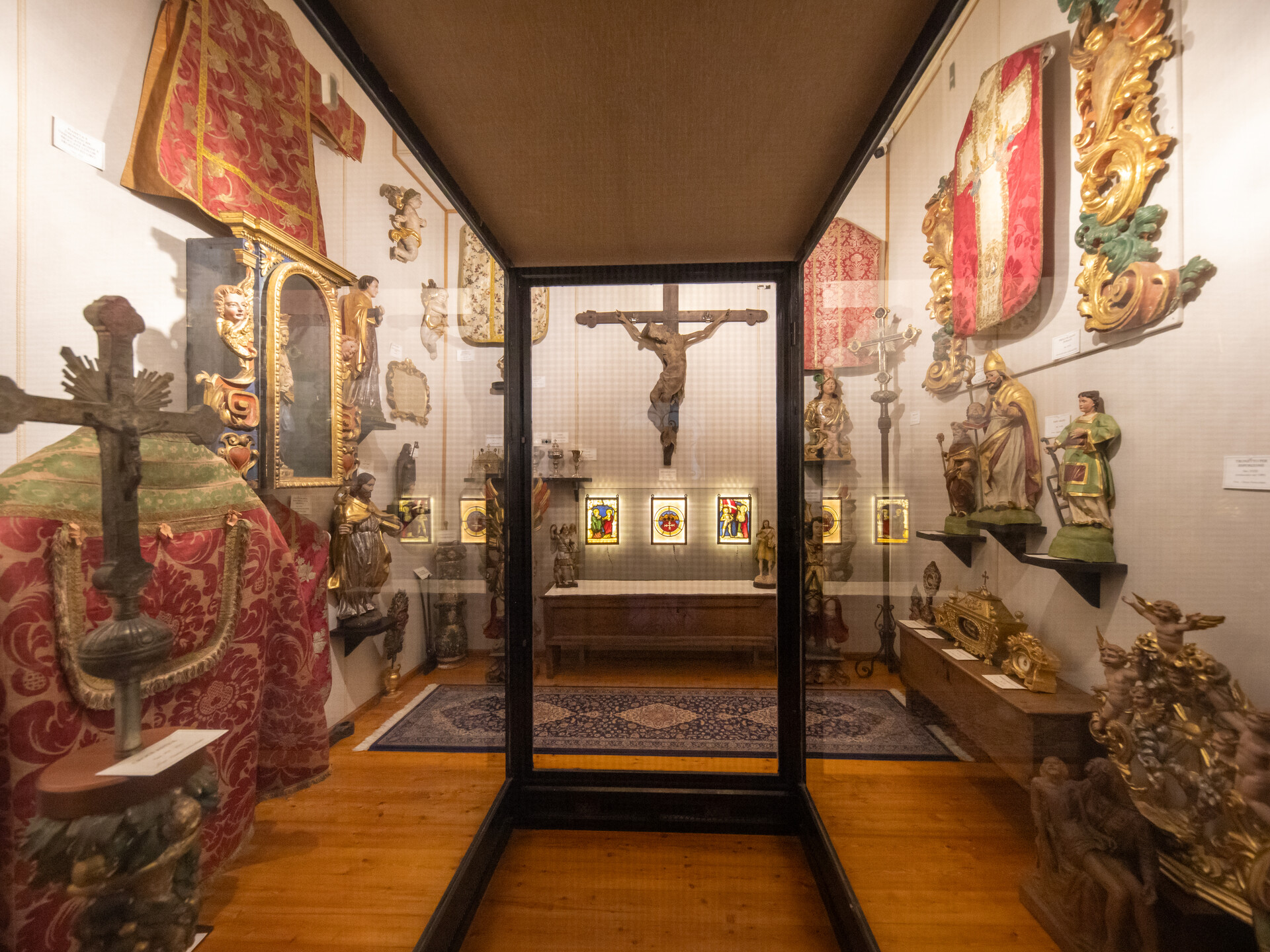 Notevole anche una pianeta in damasco rosso con ricami in oro dei Seicento. Una curiosità sono gli attrezzi per modellare le ostie.
