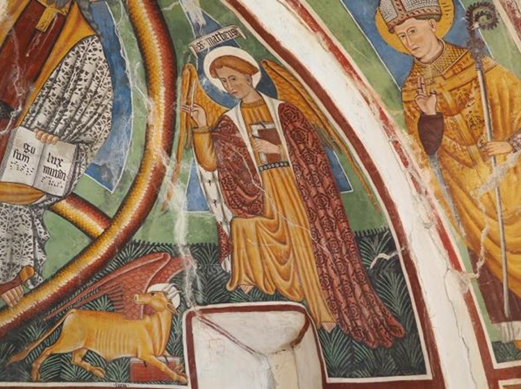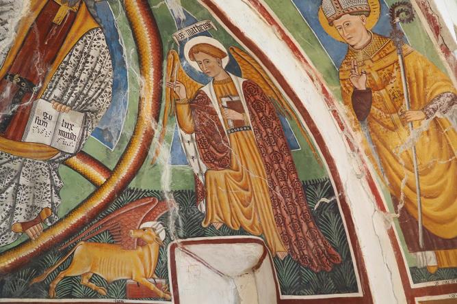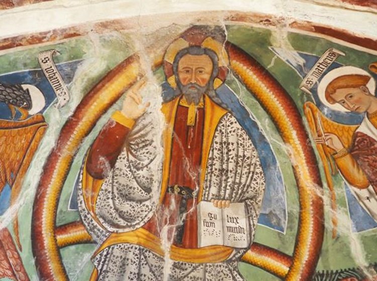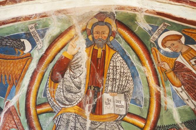 All’interno, nel catino absidale, è raffigurato Cristo in mandorla circondato dal tetramorfo, costituito dai simboli dei quattro evangelisti (l’aquila, il bue, l’angelo e il leone). Sulla parete si susseguono invece le figure dei dodici apostoli con i santi Massimo e Sigismondo.