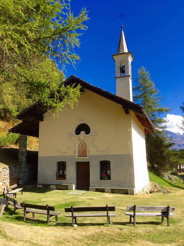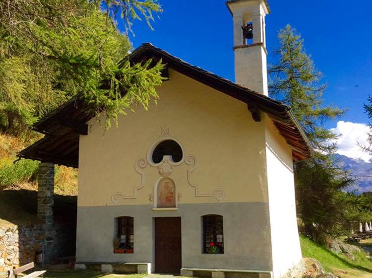 Caratteristico il sentiero (n. 105) che conduce al santuario partendo dalle Ville Rivetti ad Antagnod.