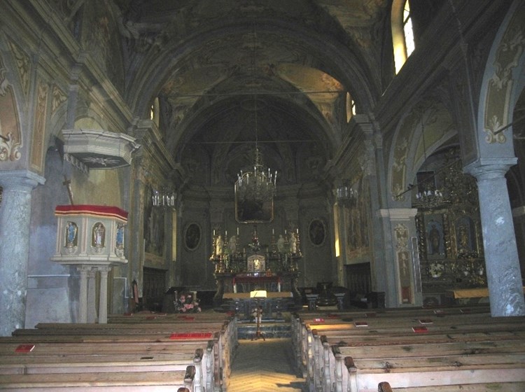 - il campanile: è anteriore alla costruzione cinquecentesca della chiesa ed è stato rialzato nel ’700; i lati terminano con dei timpani triangolari che sorreggono una cuspide in rame, del 1903, a forma di piramide, sormontata da una croce;