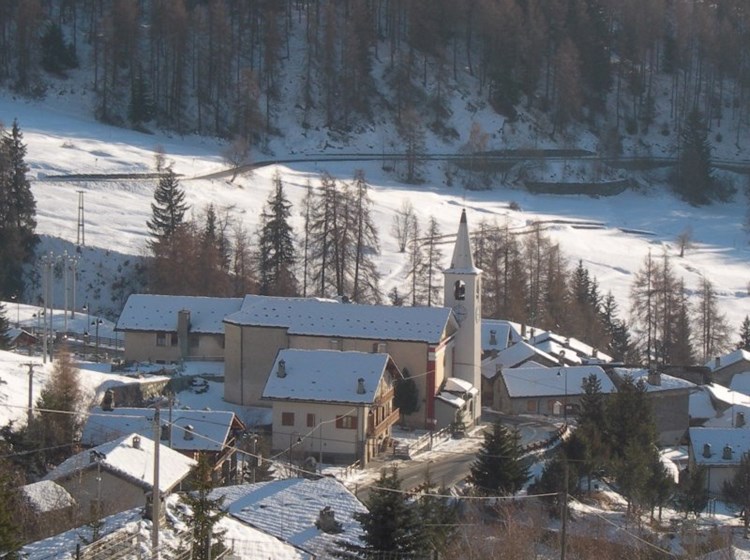 All’esterno, a destra del campanile, in cui è murata una pietra recante l’anno 1841, è visibile l’antico cimitero caratterizzato da una grande croce in pietra recante la scritta “Ici reposent nos ancêtres”.
