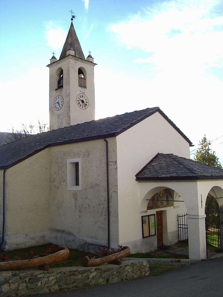 Degno di nota il caratteristico e ormai raro atrio posto all’ingresso, conosciuto nelle chiese valdostane come “porche de mariage”, con una funzione liturgica ben precisa che ne spiega il termine: al riparo di esso si celebrava il rito preliminare del matrimonio; veniva inoltre utilizzato per l’insegnamento del catechismo.