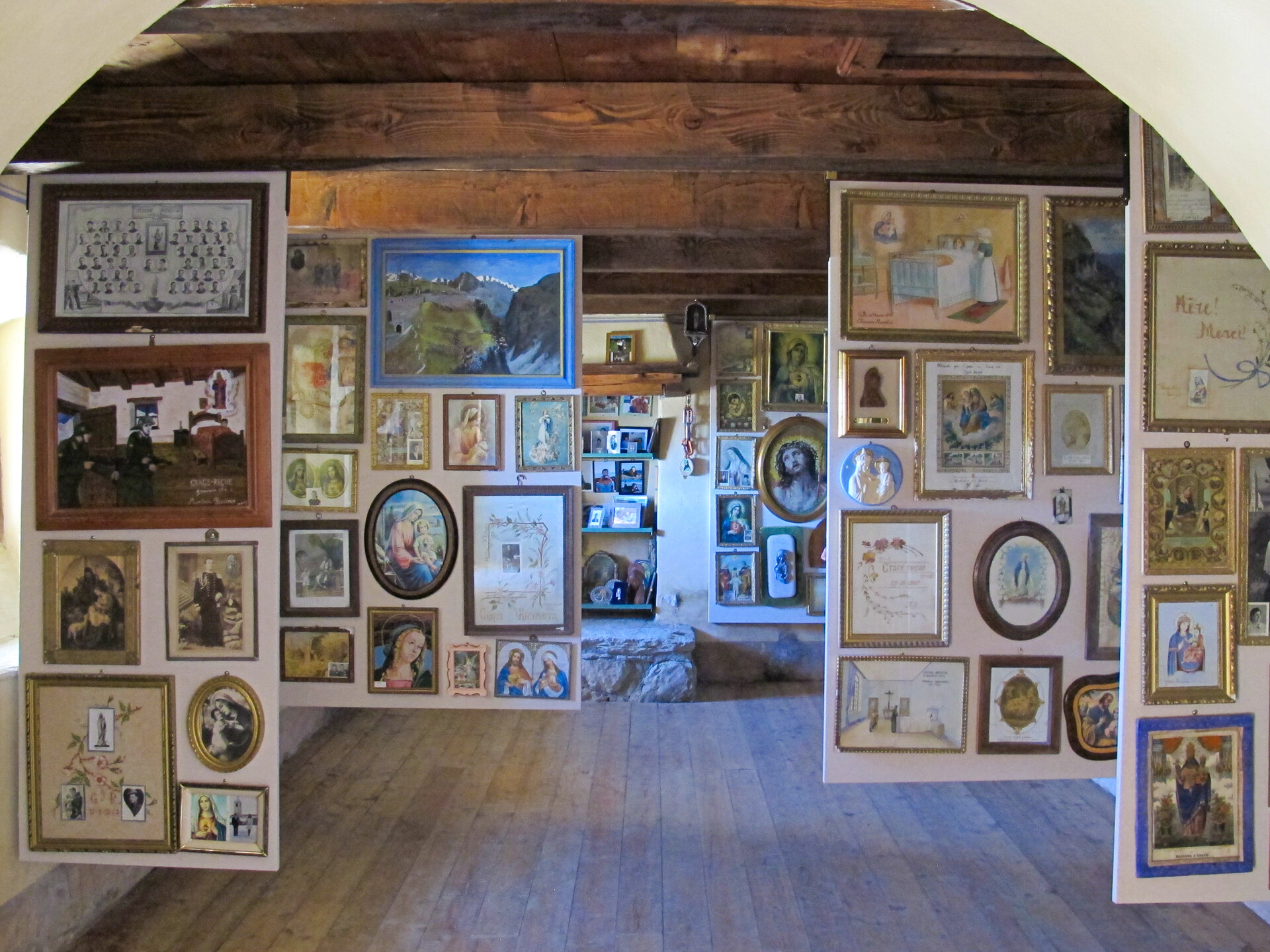 Nel 1656 fu deciso di edificarvi una cappella che fu consacrata il 26 luglio 1659 e dedicata alla Madonna delle Nevi. L’edificio attuale, ricostruito nel 1861, è a pianta rettangolare con volta a crociera decorata e abside semicircolare. Sopra l’altare è posto un dipinto, realizzato nel 1825 dal pittore valdostano Curta, raffigurante la Vergine con il Bambino e i santi Ilario, Bernardo, Bartolomeo ed Eusebio. Le pareti sono coperte da ex voto di vario genere, tra i quali alcuni interessanti dipinti sette-ottocenteschi. Degna di nota è la statua della Vergine con il Bambino, databile tra il XVI e il XVII secolo, forse contemporanea alla costruzione del primitivo santuario.