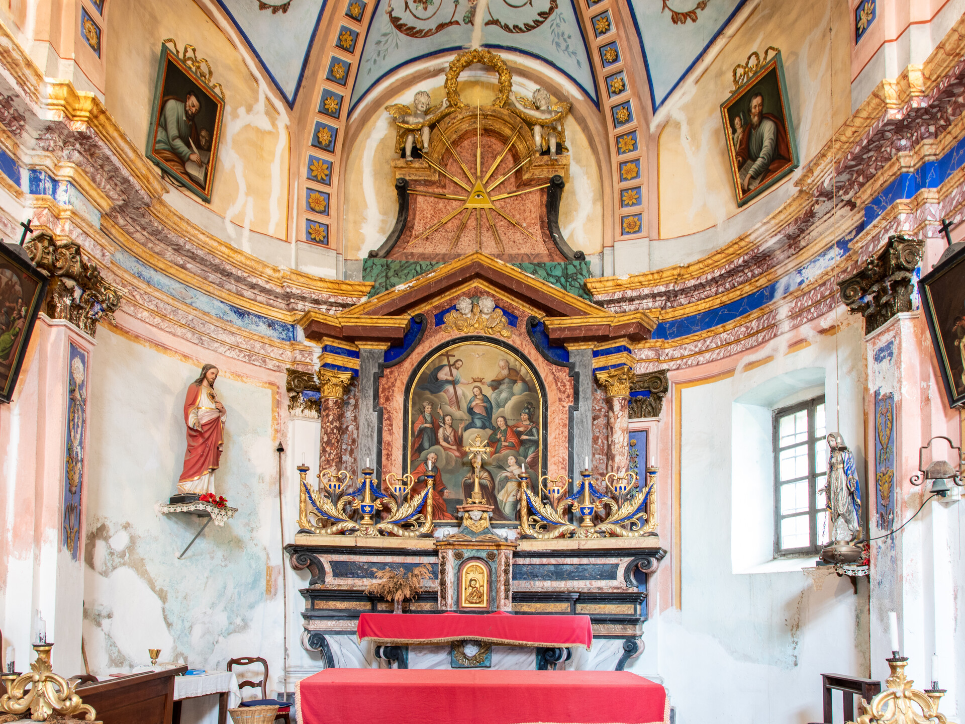 L’altare maggiore è in muratura, sovrastato da una cornice in legno intagliato e dipinto che racchiude una tela raffigurante l’incoronazione della Vergine ed i santi Pantaleone, Giovanni Battista, Giovanni evangelista, Vittore, Bartolomeo, Caterina e Anna.