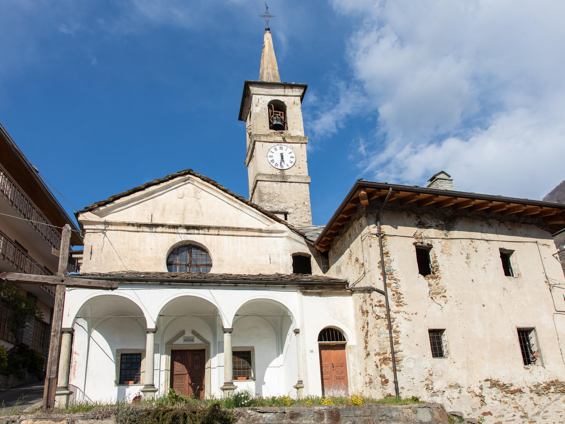 Sul lato destro sorgono la sacrestia ed il campanile che ancora oggi reca evidenti segni di colpi di mitragliatrice essendo stato teatro di scontri tra partigiani e nazifascisti nel 1944 durante la lotta di liberazione.