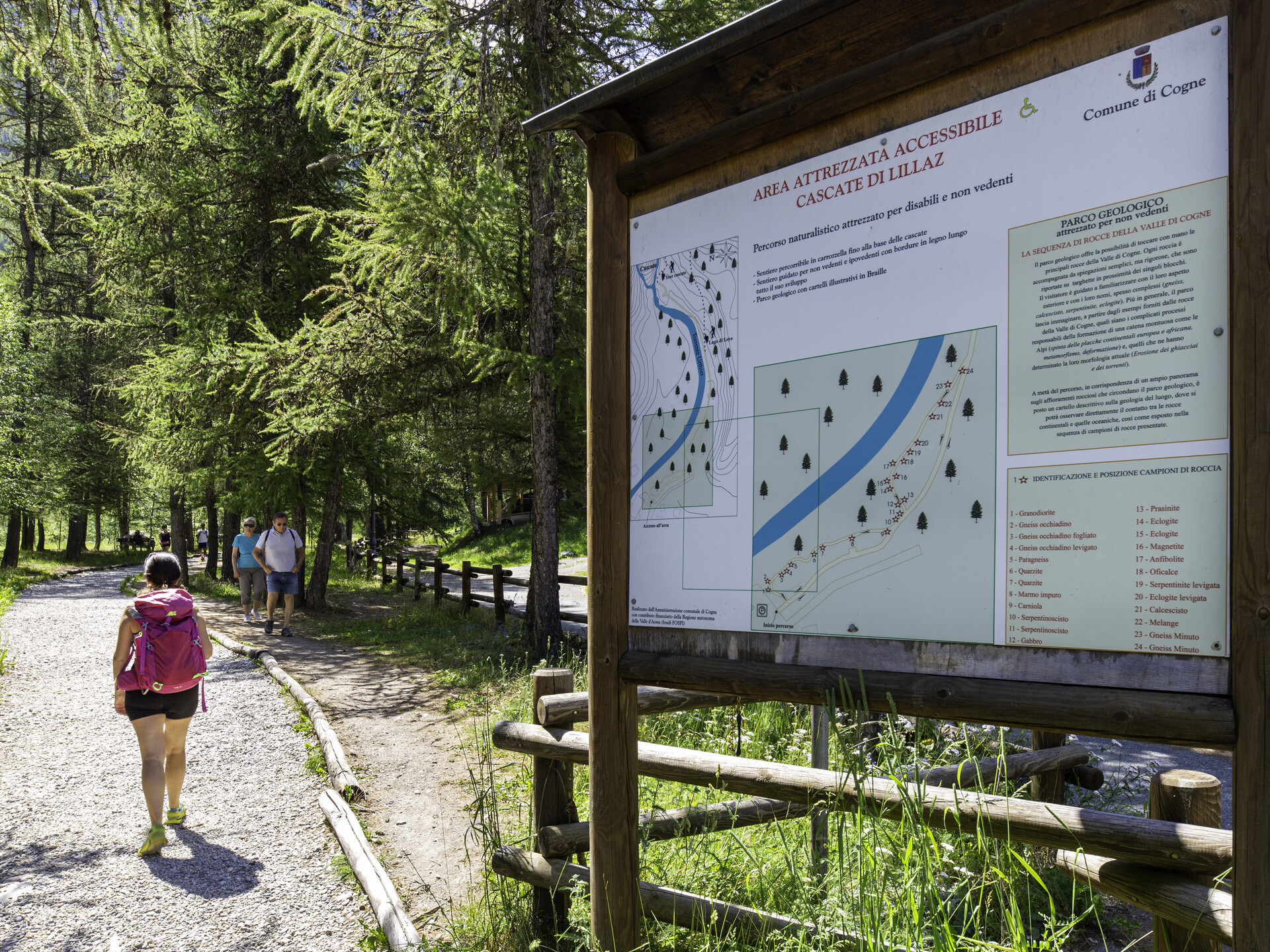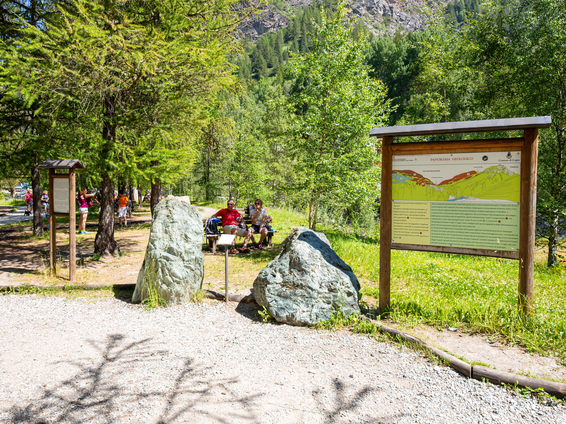 Nel primo tratto del percorso è stato inoltre allestito un parco geologico che attraverso l’esposizione in sequenza logica di blocchi di roccia di grandi dimensioni spiega la struttura geologica della valle di Cogne.