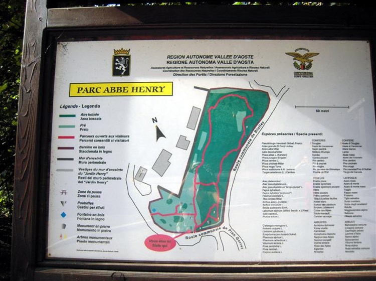Inaugurato nel 1901, ideato dall’Abate Joseph-Marie Henry, si trova in località Plan Gorret a 1.272 di altitudine. Il giardino all’epoca vantava oltre 250 varietà floreali, raccolte dall’Abate nelle sue innumerevoli peregrinazioni, e 150 esemplari di fiori esotici.Per alcuni anni il giardino botanico fu curato amorevolmente dal suo realizzatore e fu meta di numerosi turisti e botanici, finché il religioso non fu trasferito altrove e il giardino andò incontro ad un lento e progressivo abbandono. Solo nel 1987, in occasione della mostra organizzata nel quarantennale della morte dell’Abbé Henry, l’area fu ripulita e recintata, a cura del Corpo Forestale Valdostano, e le specie forestali presenti furono identificate con delle targhette poste ai piedi dei fusti delle stesse.