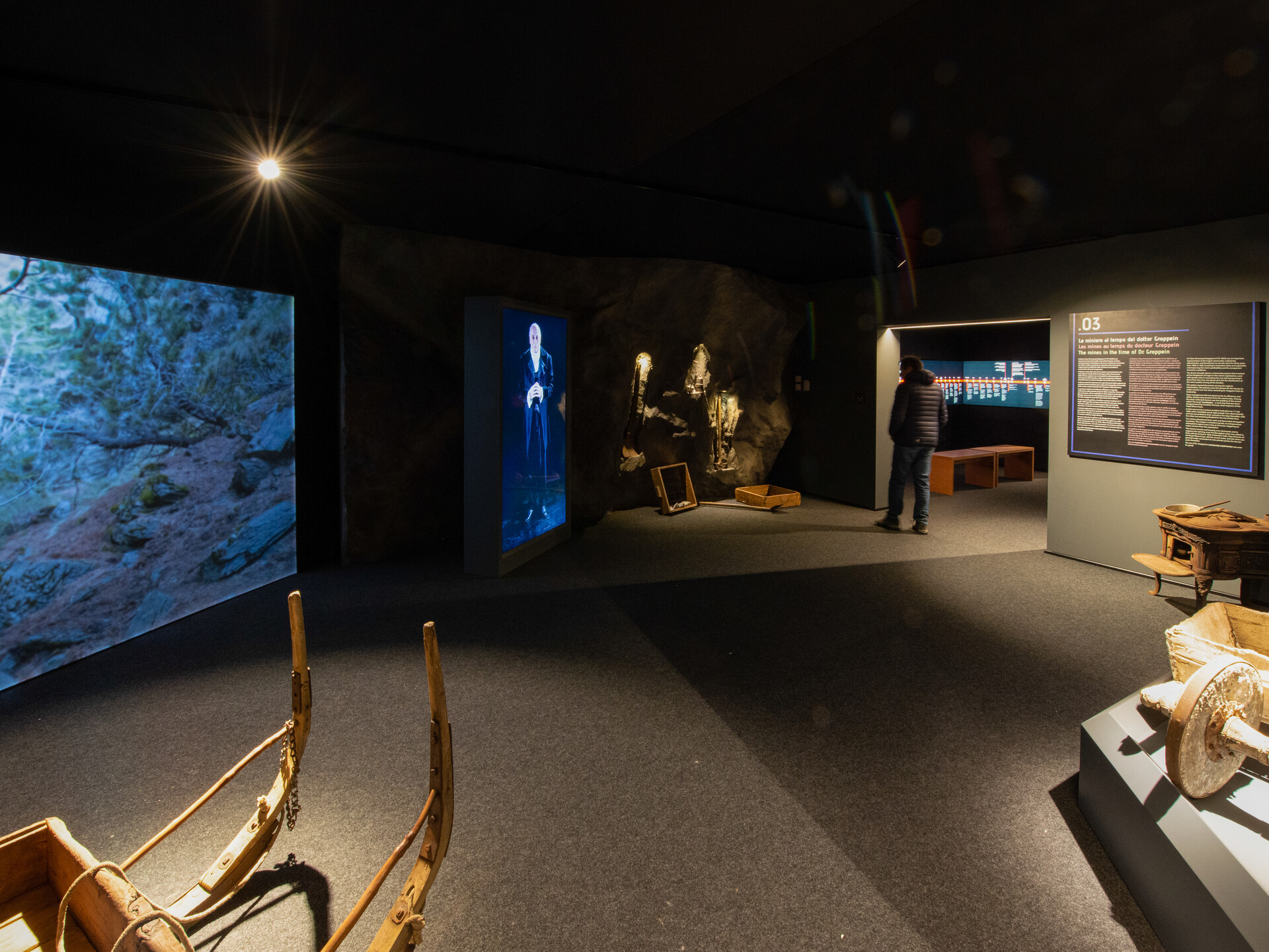 Oltre ad una panoramica sui luoghi dove questi preziosi minerali si trovano in Valle d’Aosta (Brusson, Cogne, La Thuile, Ollomont, Saint-Marcel) si può rivivere l’esperienza della vita in miniera, in particolare nei giacimenti di Cogne: i luoghi di lavoro, la difficoltà delle operazioni in galleria fino all’ultimo viaggio del materiale verso Aosta per la sua trasformazione.