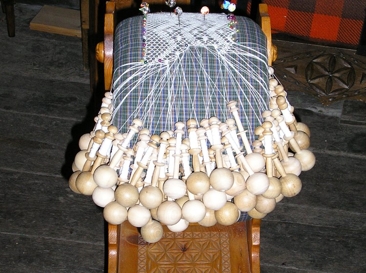 Le abili dita femminili intrecciano motivi con il velocissimo gioco dei fuselli sul cuscino circolare del tombolo (un cerchio, il “coessein”, imbottito con paglia e lana, sostenuto dal suo singolare “cavalot”, mobiletto in legno scolpito col classico motivo del rosone, il monogramma di Cristo e l’anno di fattura, nonché il nome della sua prima proprietaria).